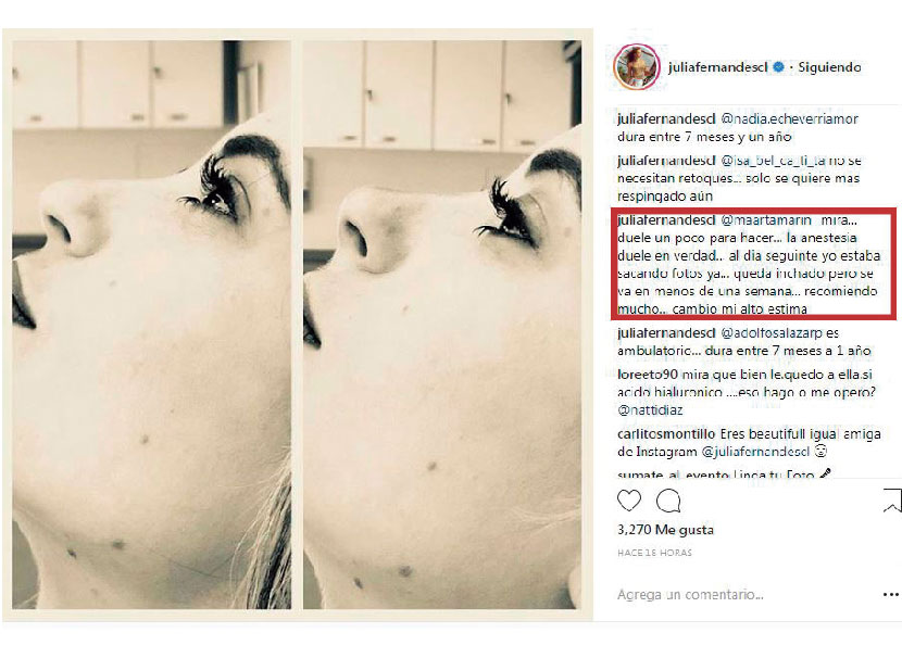 Hace unos días te contábamos de la romántica declaración de amor que realizó Julia Fernández a su pololo José Ramón Astorga, el primo de Pangal Andrade. Pero esta vez la brasileña ha ocupado sus redes para contar sobre un retoque facial que se hizo en su rostro ¿De qué se trata? Aquí te contamos