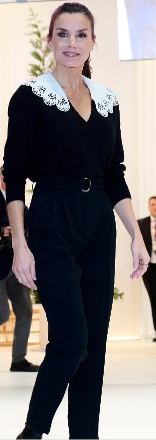 La noble de 50 años usó un suéter negro con cuello en V y con mangas tres cuartos, junto con un pantalón negro de pierna recta que llega hasta los tobillos. Este look lo acompaño con unas botas negras puntiagudas con tacones y un gran cinturón negro.